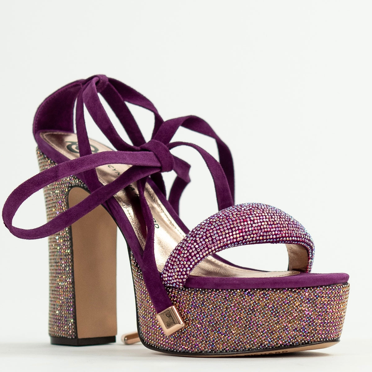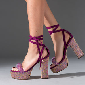 Did someone call for the queen? The Jules platform is completely embossed in decadent crystal with soft kid suede ankle wraps. These pink heels are entrancing and glamorous.