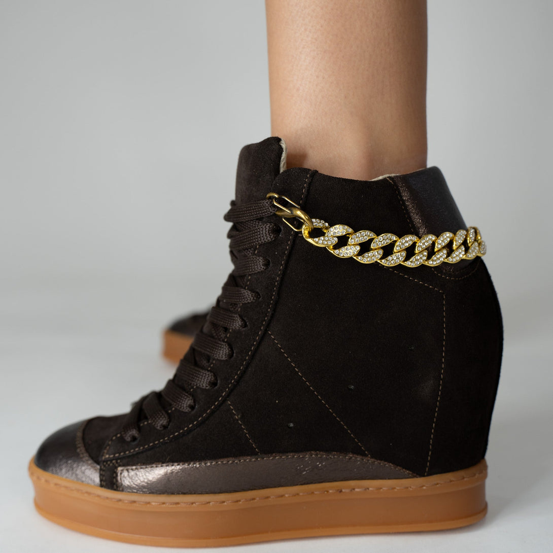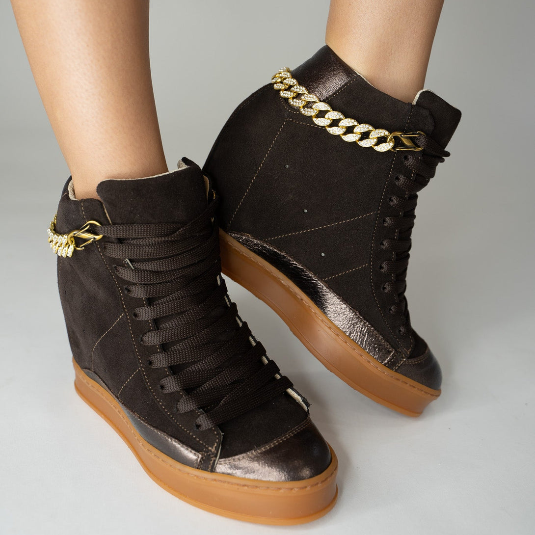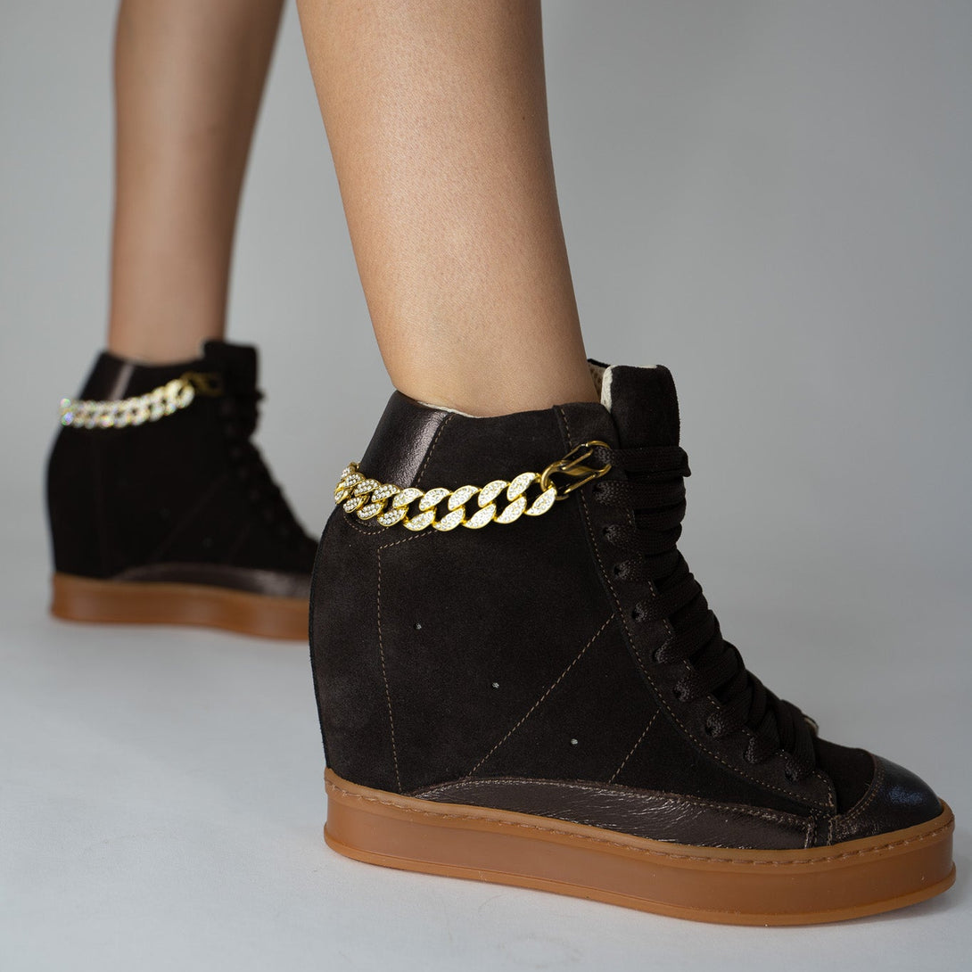 Fearless Choclate Suede High Top Wedge Sneaker with Gold Flier Chains