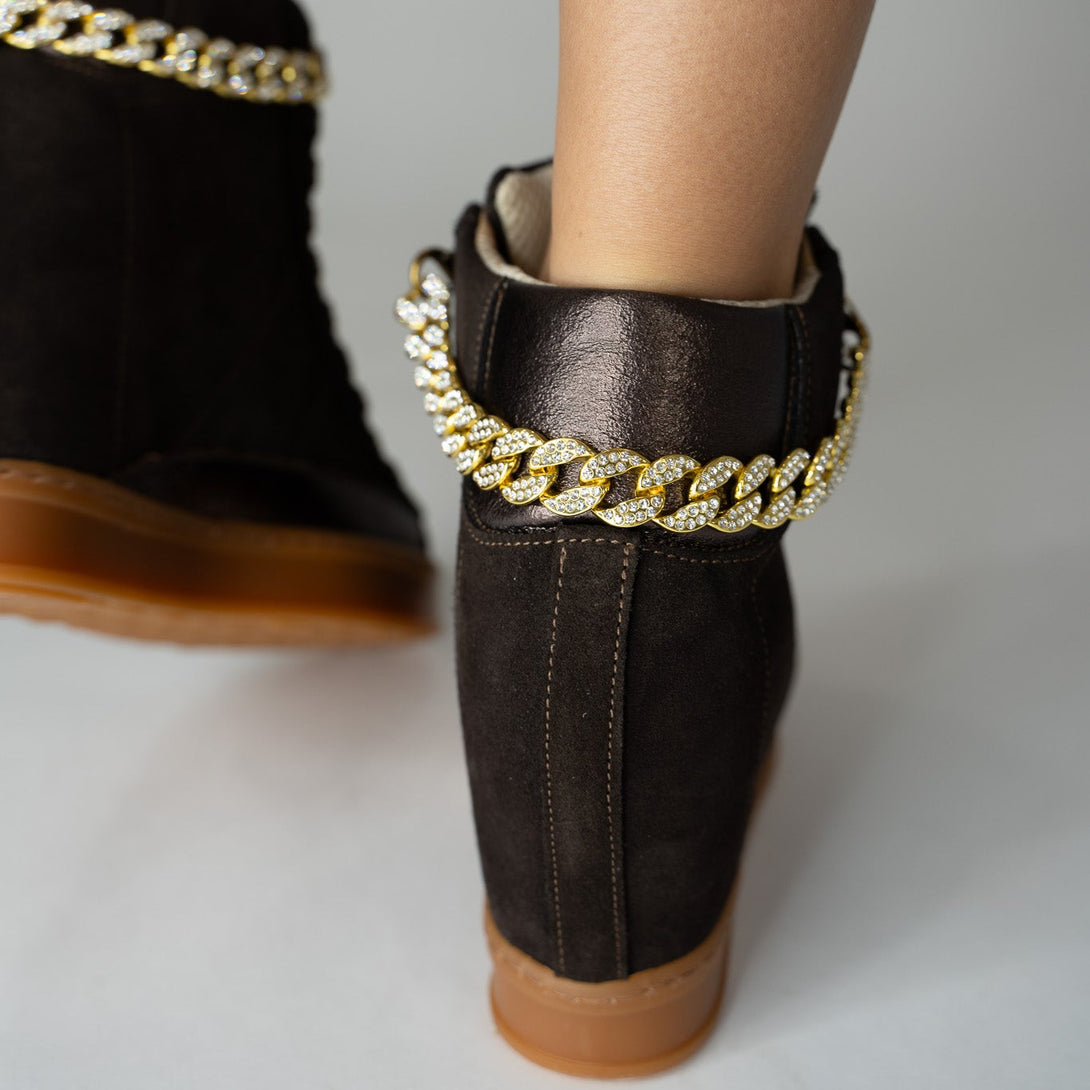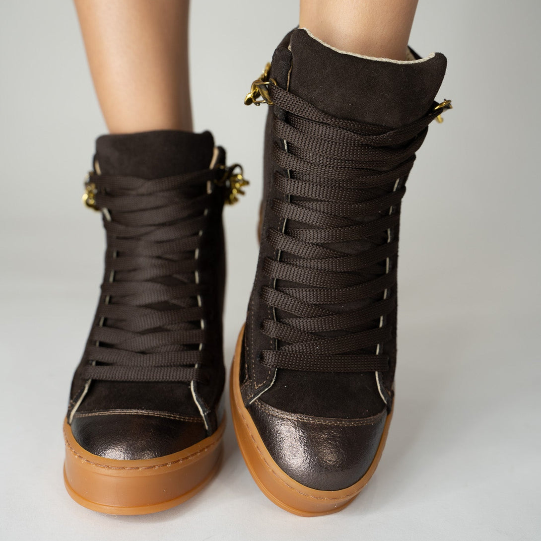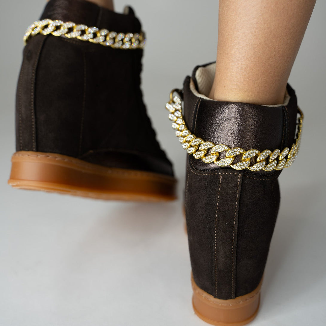 Fearless Choclate Suede High Top Wedge Sneaker with Gold Flier Chains