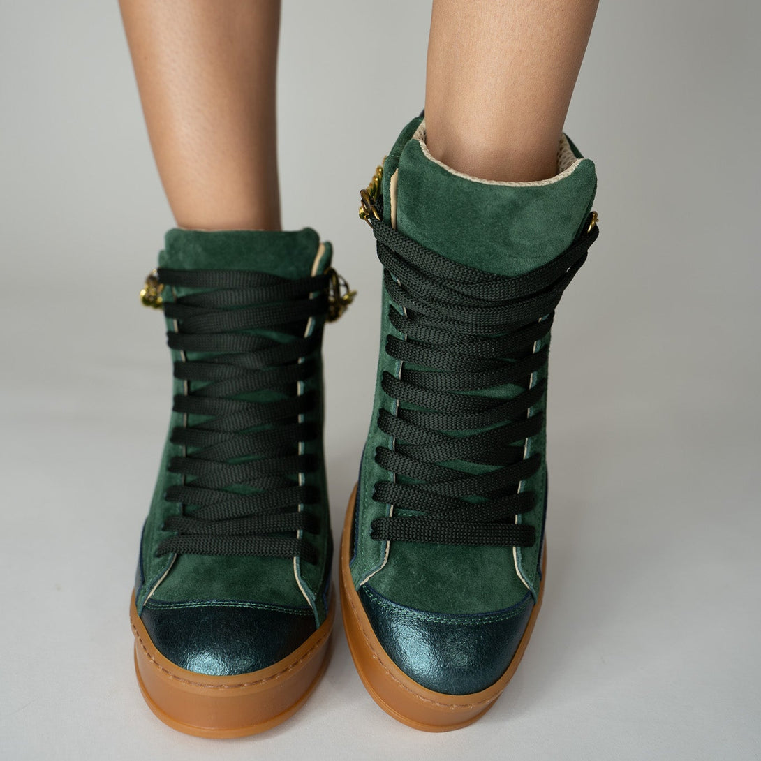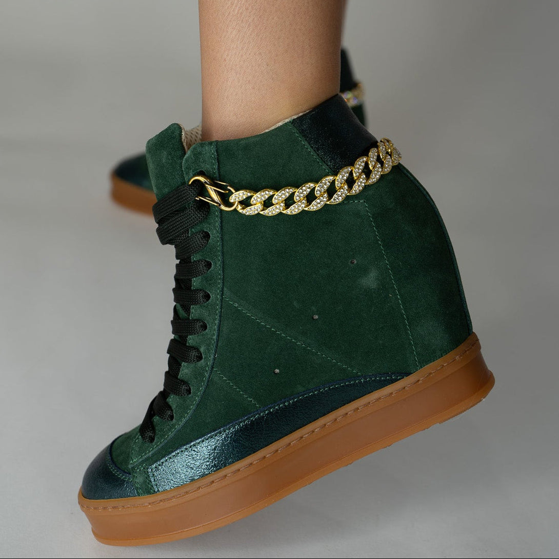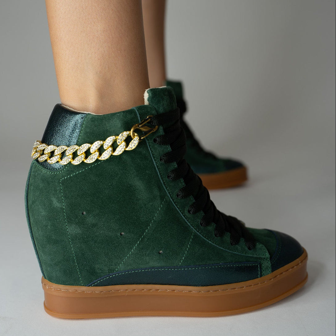 Fearless High-Top Forest Green Suede Wedge Sneaker with Gold Flier Chains