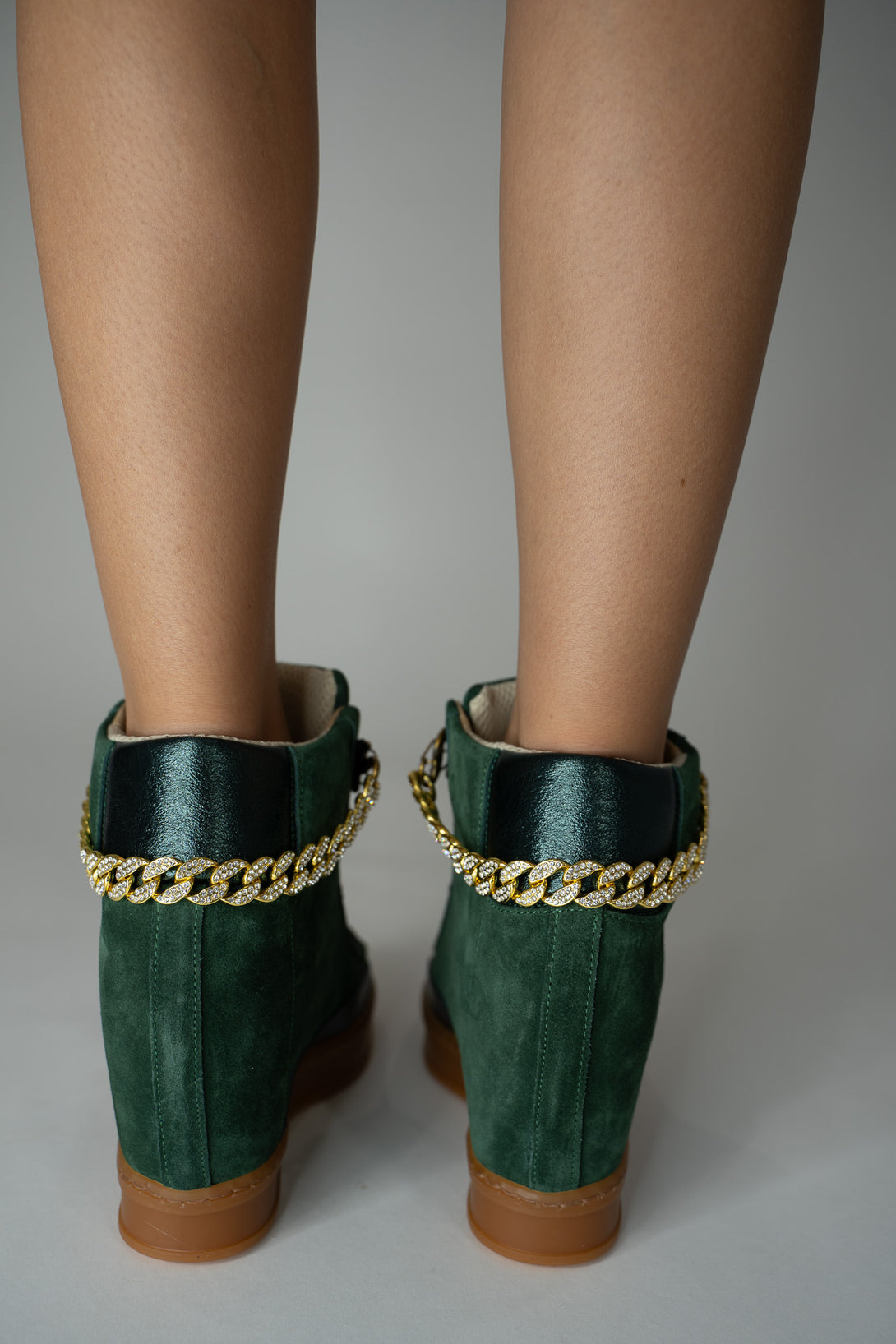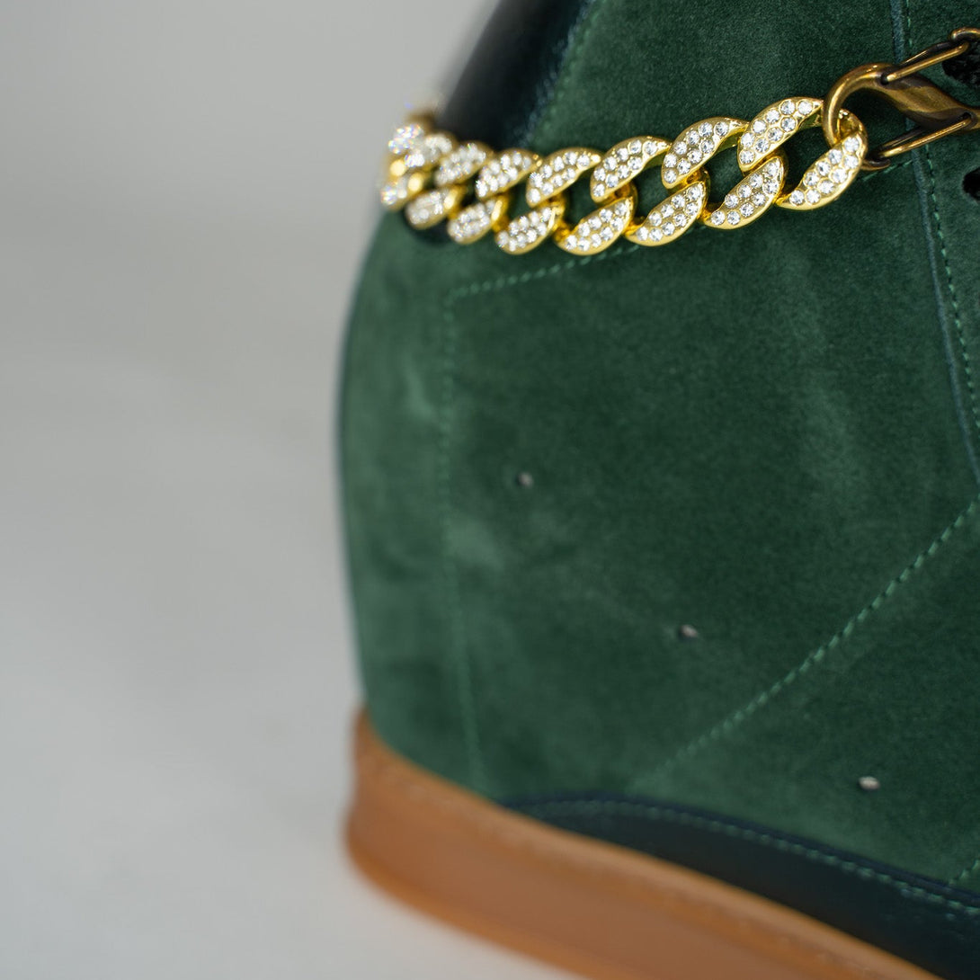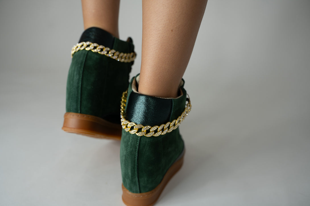 Fearless Wedge Sneaker – Forest Green Suede with Gold Flier Chains