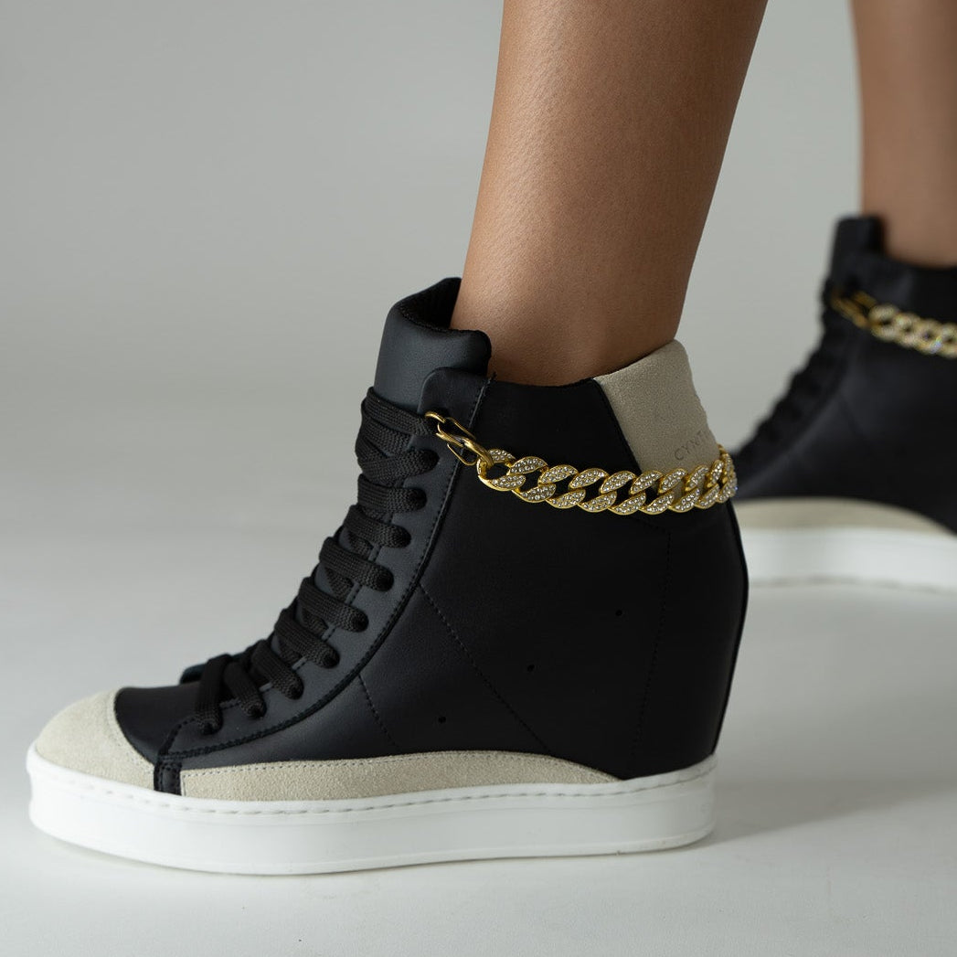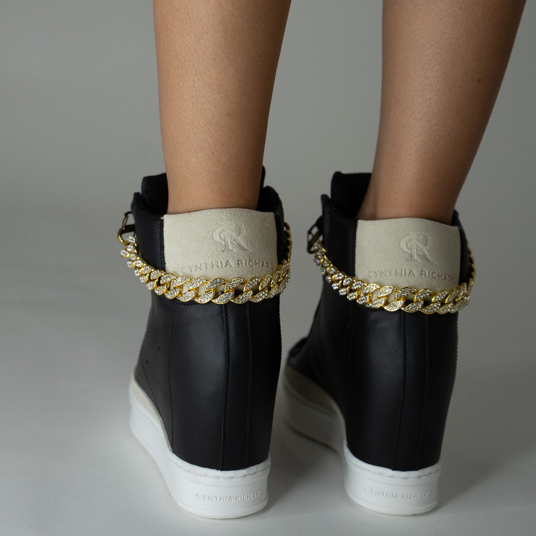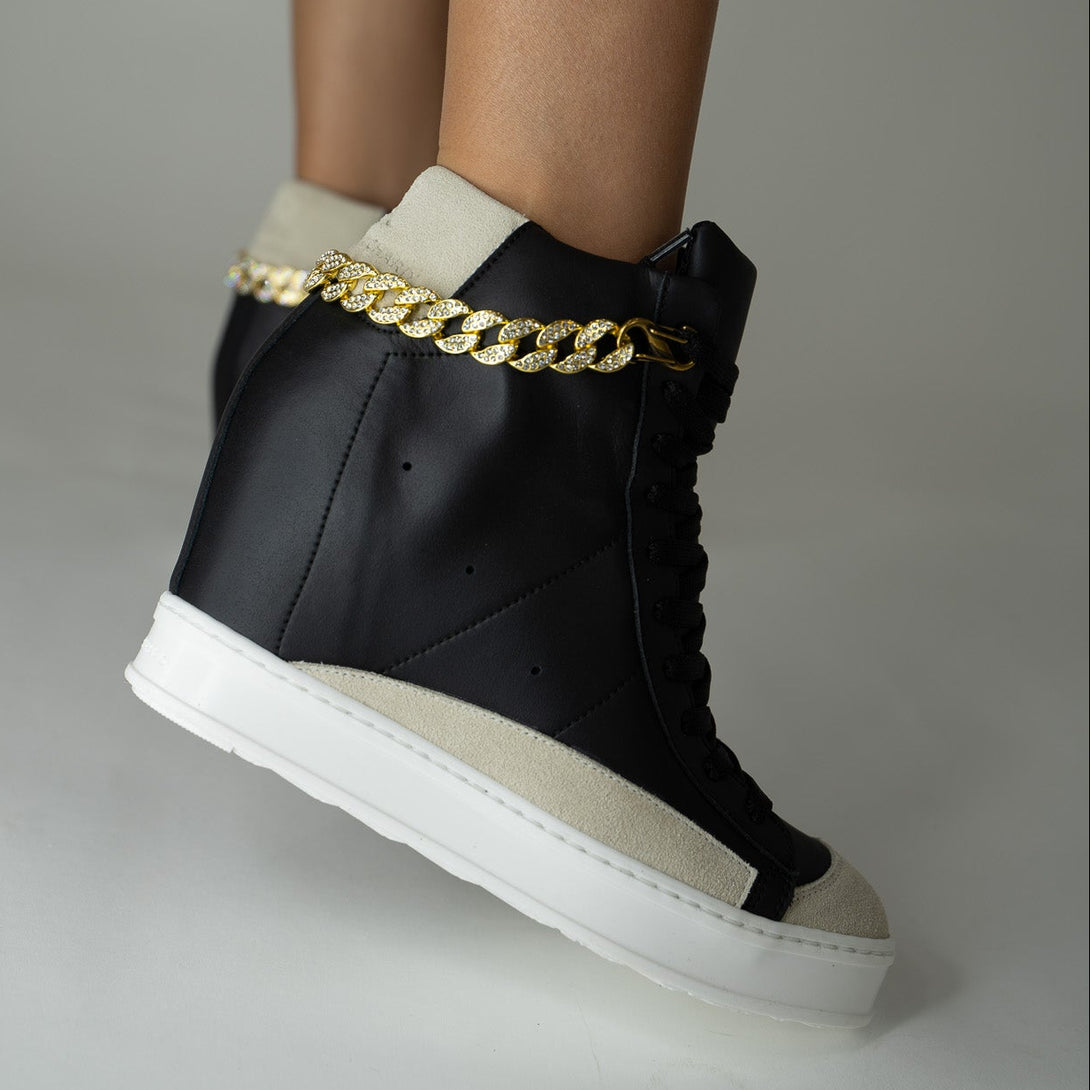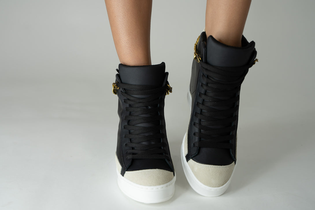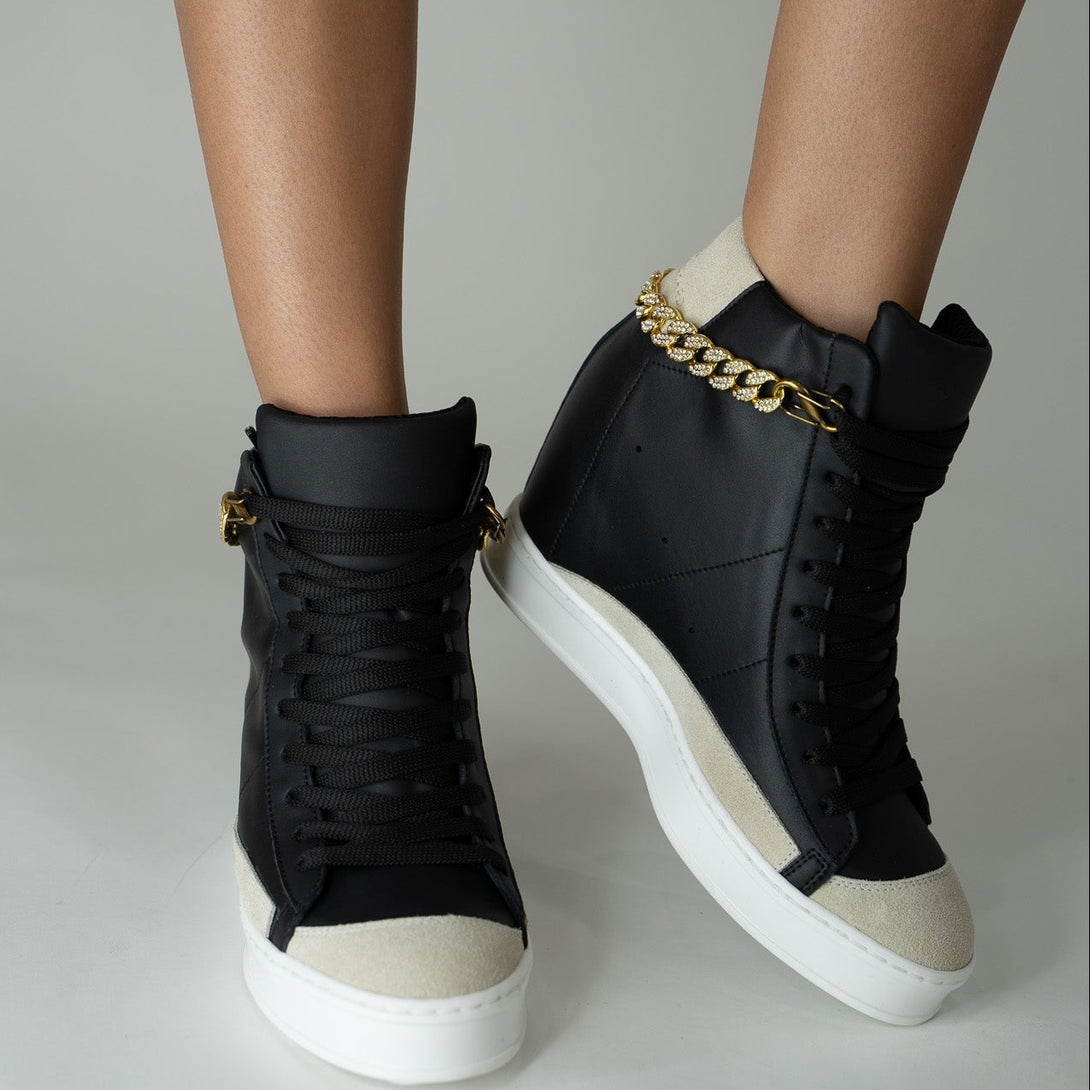 Fearless High-Top Black Leather Wedge Sneaker with Gold Flier Chains