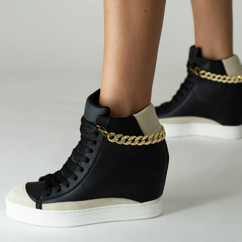 Fearless Wedge Sneaker – Black Leather with Gold Flier Chains