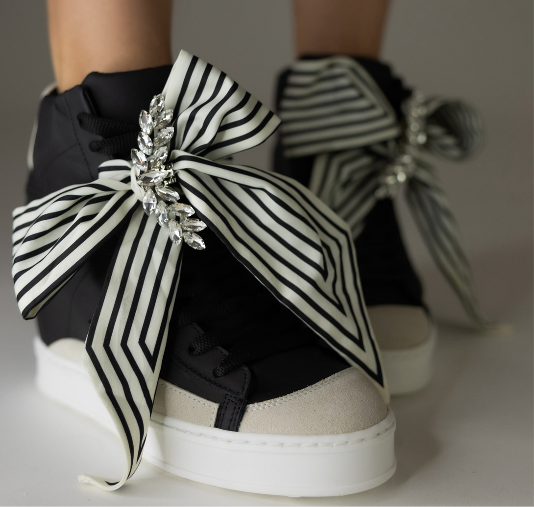 The Fearless Celine turns the classic black wedge sneaker into a statement piece worthy of front-row seats and cobblestone streets. Handcrafted in Italy from smooth black Nappa leather, this limited-edition design features oversized black-and-white silk-scarf bows, crystal-studded bling, and our signature hidden wedge—bringing couture drama to your everyday.