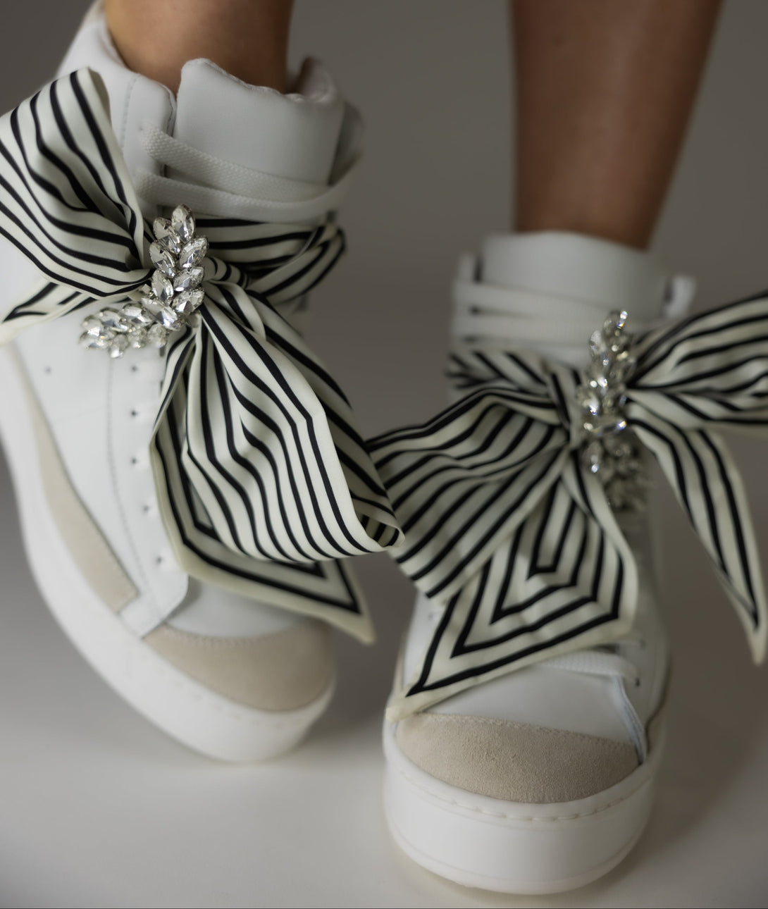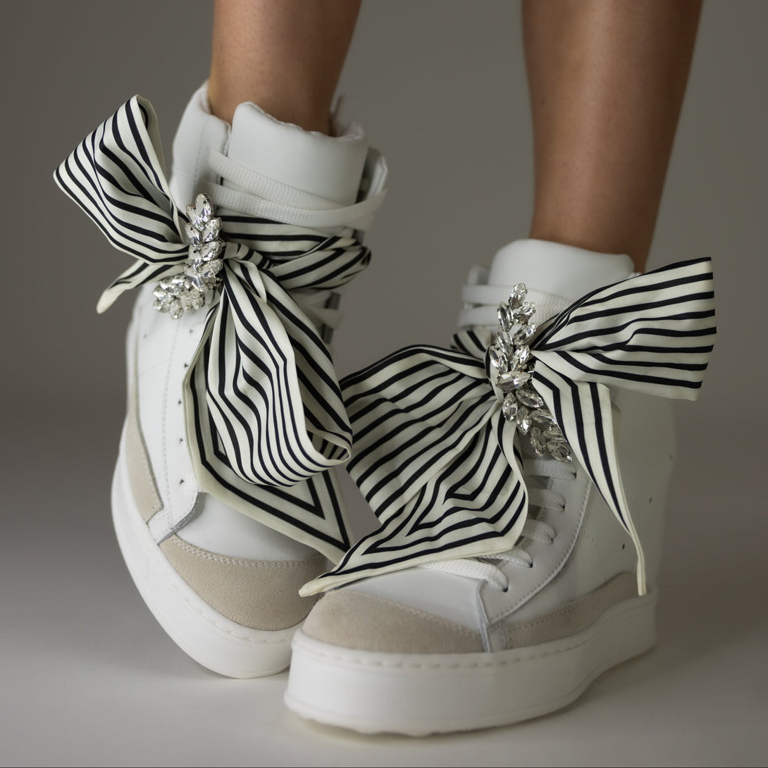 If you’re searching for black wedge sneakers with silk scarf-inspired bows, crystal embellishments, and Italian-made craftsmanship—this is the one.